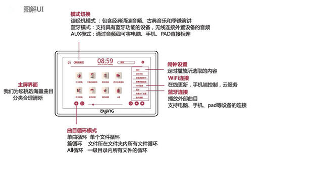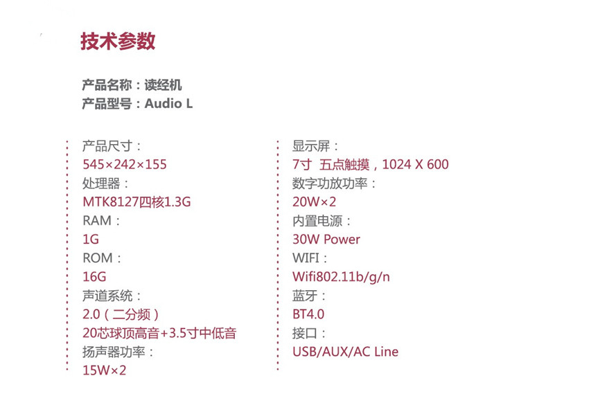 读经机全球首次把多点触摸技术与读经机相结合,解决了操作困难的问题,首次将智能CPU与读经机相结合,实现了手机遥控、云端课堂等智能互联功能;内置顶级DSP数字功放与HIFI级喇叭,针对胎教和儿童读经进行声音校调,人声器乐定位精准、真实优美;在设计上是由红点奖团队全程开发,在材质上是由一流制造商提供品质保障。