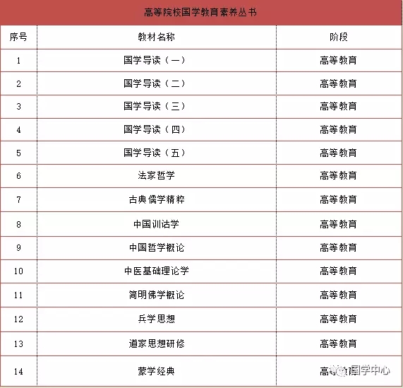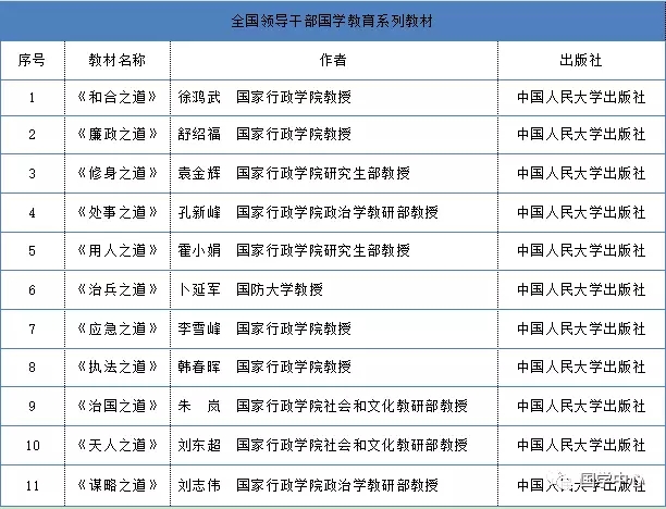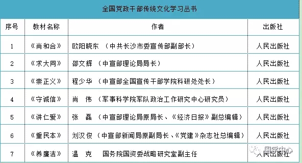 国学文化标准化教材——《全国领导干部国学教育系列教材》,共11册。同时,课题组与中宣部理论局多位专家合作,推出了面向全国党员系统的“传统文化与社会主义核心价值观”解读丛书——《党政干部传统文化学习丛书》,共七册。这两套教材为提升各级行政机构的执政思想、强化决策能力、创新执行策略、扩大用人视野、融入德性思维等各方面,提供了完整的理论体系和策略指导。