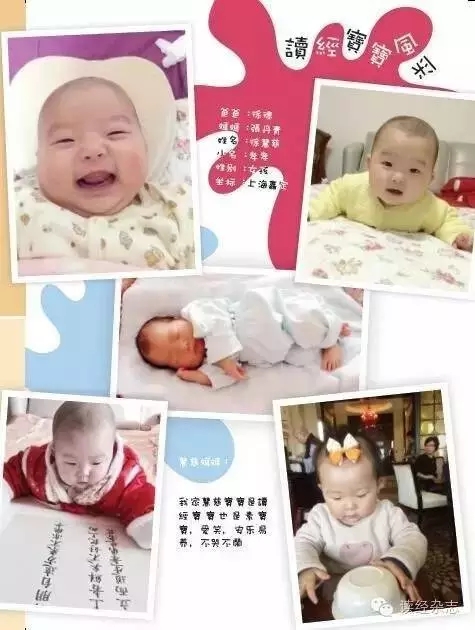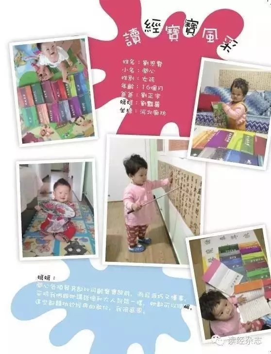 读经宝宝风采”栏目。读经宝宝,即接受了读经胎教出生的婴儿宝宝。下面我们一起回顾一下《读经》2016年6期的读经宝宝的可爱姿态,同时也欢迎更多的宝妈和宝爸们发来您家宝宝的可爱照片(照片要求见文末):