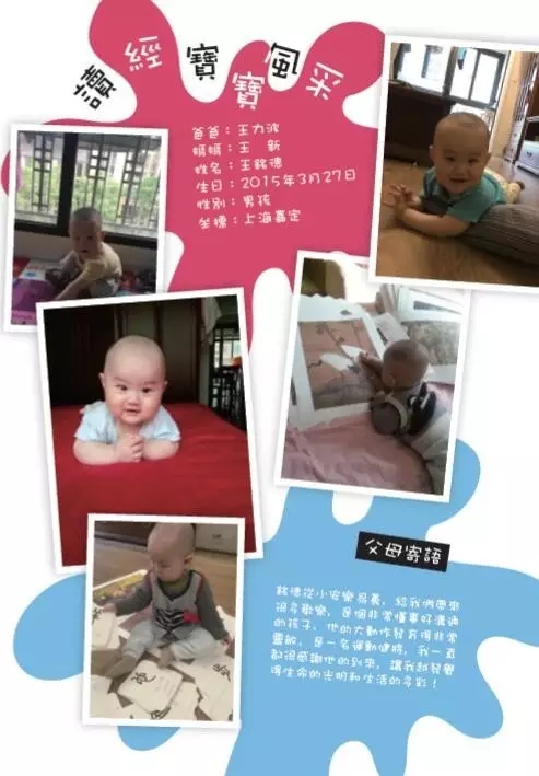 父母寄语:铭德从小安乐易养,给我们带来很多欢乐,是个非常懂事好沟通的孩子,他的大动作发育得非常灵敏,是一名运动健将,我一直都很感谢他的到来,让我越发觉得生命的光明和生活的多彩!