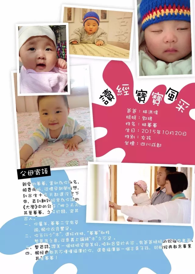 父母寄语:亲爱的蓁蓁,当初为你取名,破费周折,从怀孕就开始想,到出生十多天都还没定下来,直到翻到经常为你读的《
